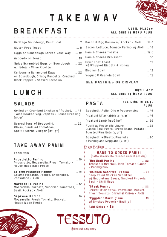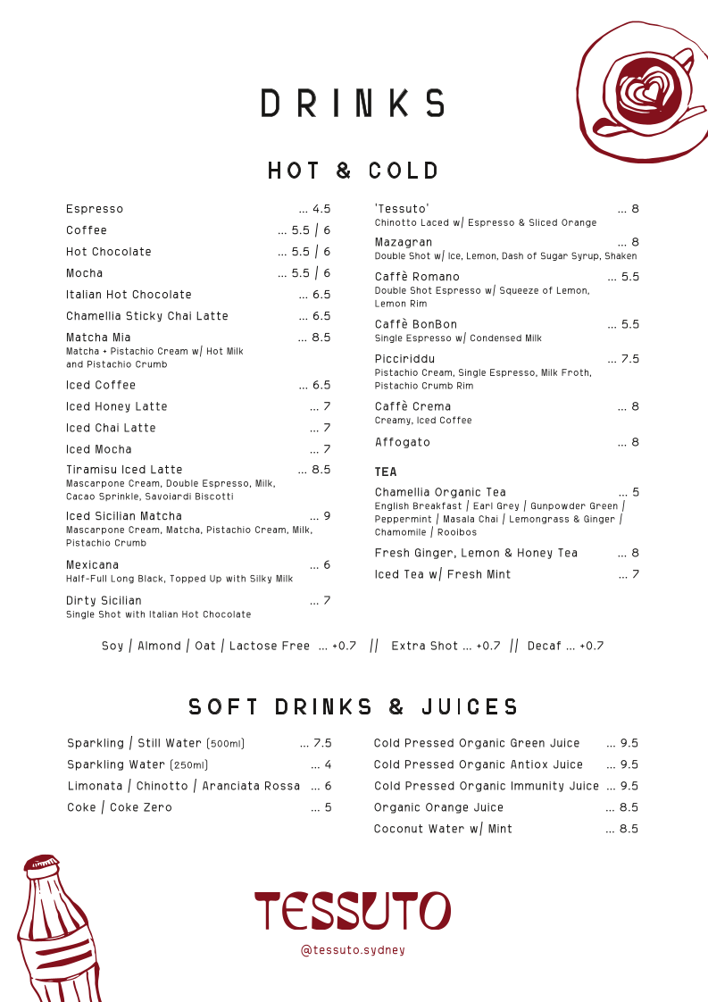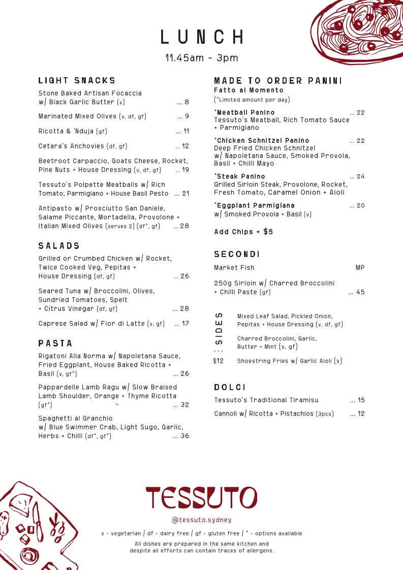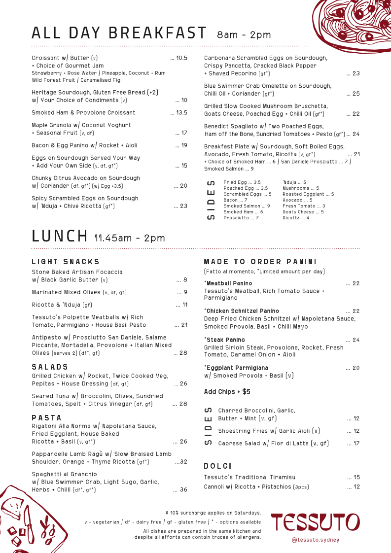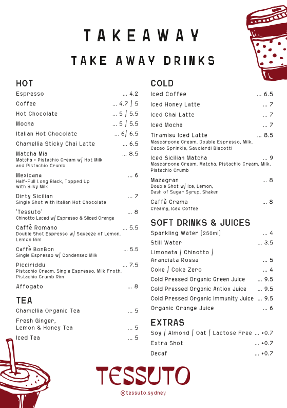 As you step into Tessuto, you’ll be greeted by a vibrant atmosphere filled with laughter and the tantalizing aroma of freshly brewed coffee. This is not just any café; it’s a haven for food lovers and coffee enthusiasts alike. The Italian-inspired menu showcases a delightful selection of lunch options that promise to tantalize your taste buds. Indulge in their famous Tessuto's Traditional Tiramisu for A$15.00, an exquisite layers of rich flavor that melt in your mouth, or savor the delightful Cannoli with Ricotta and Pistachios (3pcs) for just A$12.00.